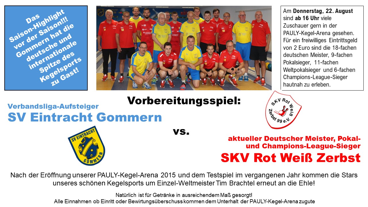 Das erste Saison-Highlight für die Kegler von Eintracht Gommern steigt schon vor dem Start in die neue Spielzeit. Am Donnerstag ab ca. 16 Uhr ist in der heimischen PAULY-Kegel-Arena kein Geringerer als der 18-fache Deutsche Mannschaftsmeister, vielfache Weltpokal-, Champions League- und DKBC-Pokalsieger SKV Rot Weiß Zerbst zu Gast.